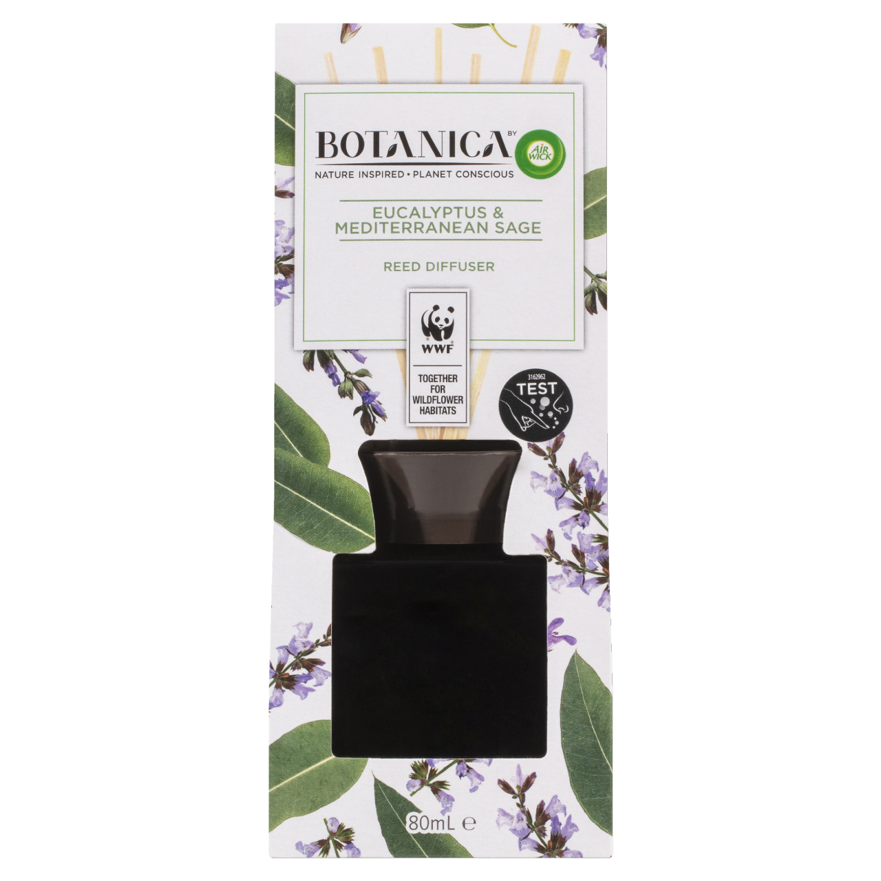 Botanica by Air Wick Eucalyptus and Mediterranean Sage Reed Diffuser helps create a bright and relaxed environment for your home with this aromatic blend of fresh eucalyptus, marine notes and clary sage. The clary sage essential oil in this fragrance is responsibly sourced from Provence in the South of France, honouring the traditional craftmanship of the local farmer